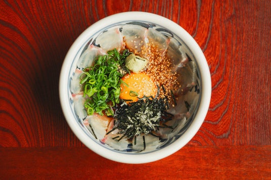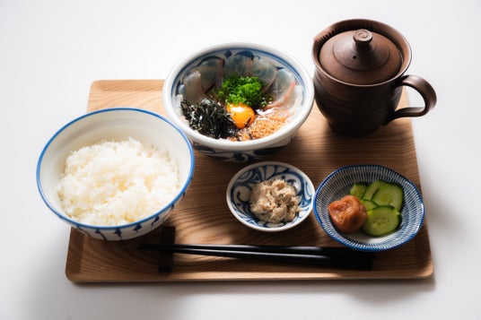 - 熟成した「白寿真鯛0」の刺身に、農家直送の国産こしひかりと純国産鶏の卵を合わせた特製鯛めし
