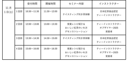 日本紅茶協会では、11月1日を紅茶の日と定め、皆様に紅茶を知っていただくための催しを行っています。今回はティーインストラクター・オブ・ザ・イヤー2025上位受賞者によるデモンストレーションと産地別茶葉飲み比べ利き茶を実施します。第1回と第3回では、2025年10月12日に開催される「ティーインストラクターオブザイヤー2025」における上位受賞者による受賞レシピを紹介。また美味しい紅茶の入れ方のデモンストレーションも実施します。第2回と第4回では、日本紅茶協会認定ティーインストラクター養成講座で学ぶテイスティングの簡易版を体験できます。6種の産地別茶葉を飲み比べの後、3種類を利き茶していただきます。喫茶来だからできる、特別な紅茶体験をこの機会に。セミナー参加者には日本紅茶協会会員会社の紅茶商品をプレゼント!