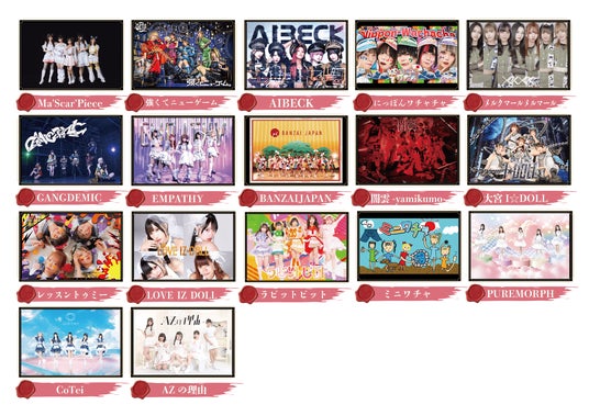 Ma'Scar'Piece/強くてニューゲーム。/AIBECK/にっぽんワチャチャ/メルクマールメルマール/GANGDEMIC/EMPATHY/BANZAI JAPAN/闇雲-yamikumo-/大宮I☆DOLL/レッスントゥミー/LOVE IZ DOLL/ラビットビット/ミニワチャ/PUREMORPH/CoTei/AZの理由(順不同)