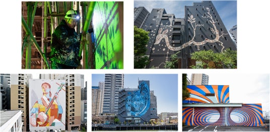 (上段左から) TENNOZ ART FESTIVAL 2019 Work by Meguru Yamaguchi、TENNOZ ART FESTIVAL 2025 Work by Yusuke asai (下段左から) TENNOZ ART FESTIVAL 2019 Work by ARYZ、TENNOZ ART FESTIVAL 2019 Work by Meguru Yamaguchi、TENNOZ ART FESTIVAL 2020 Work by Momo Yoshino 上段・下段中央 Photo by Yusuke Suzuki(USKfoto)、下段左・下段右 Photo by shin hamada