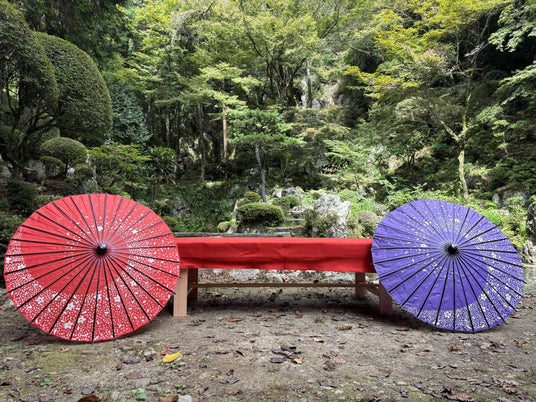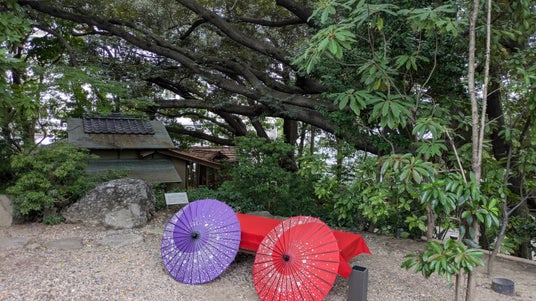 ・庭園入口付近に赤い繊毛で装飾したベンチと和傘を設置し、そこから写真を