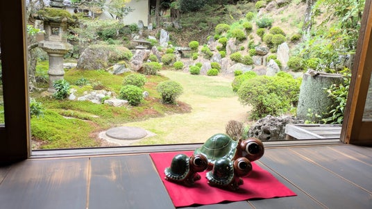 ・庭園の中央にある亀岩と一緒に写真を撮影していただける、