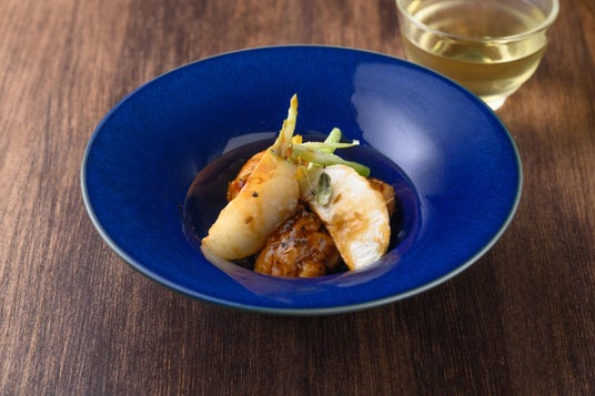 カラリと揚げた鶏もも肉と蕪に、中華あんをトロリと絡めた、やさしい酸味と香りが後を引く上質な一皿です。カルダモンとクローブの香りもアクセントとなってお酒との相性も抜群です。