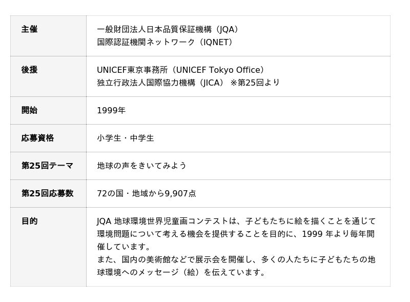 一般財団法人日本品質保証機構(東京都千代田区、理事長:石井 裕晶、略称:JQA)と国際認証機関ネットワーク(スイス・ジュネーブ、略称:IQNET)が主催し、UNICEF東京事務所(東京都渋谷区)と独立行政法人国際協力機構(東京都千代田区、略称:JICA)の後援(※)による「JQA地球環境世界児童画コンテスト」は、1999年より開催しております。