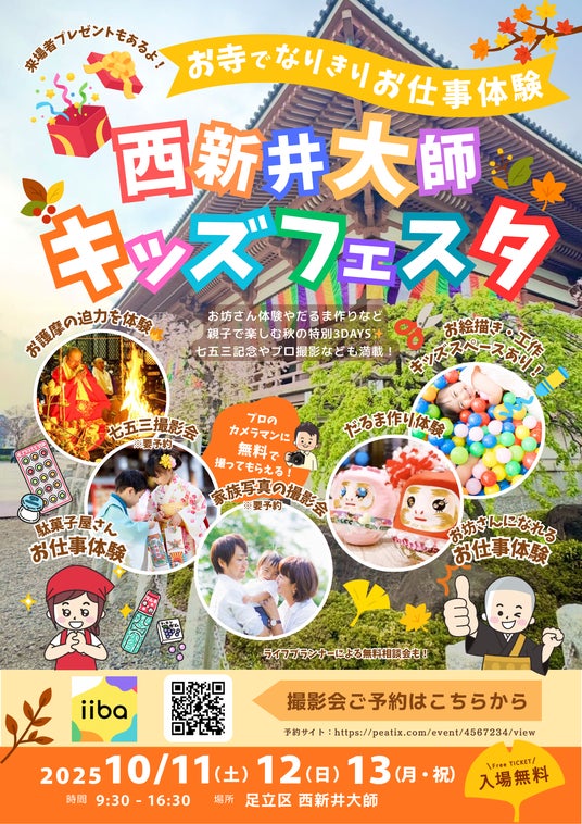 子育てマップアプリ『iiba』を運営する株式会社iiba(本社:東京都港区、代表取締役社長:逢澤奈菜、以下当社) は、10月11日(土)~13日(月・祝)の3日間、親子で楽しめる「お仕事体験×無料撮影会」を西新井大師で開催します。