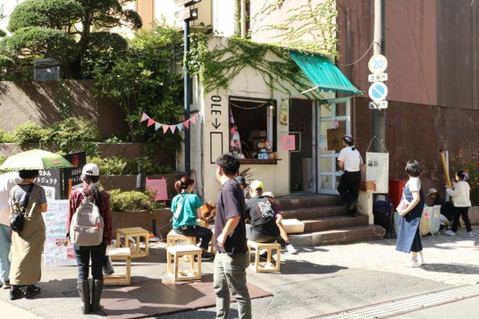 温泉街南側エリアの拠点「MIDORI SOW」は廃屋になっていたアパートをリノベーションした複合施設。今回は隣地の道路用地の一部も社会実験として活用して、「農場の感謝祭」をコンセプトに"つながりを耕すミドリソウ・マルシェ"をつくりあげます。