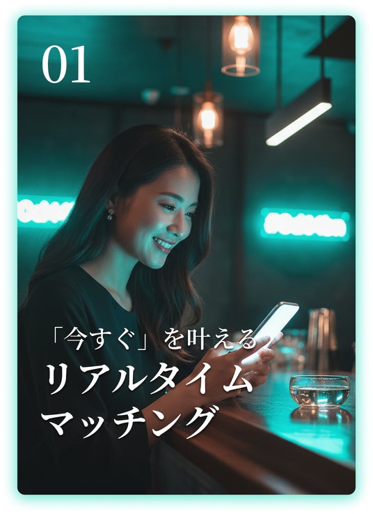 令和になってさらにマッチングアプリの利用は当たり前の世の中になりましたが、「マッチングしてから会うまでの長いやり取りが面倒」「1対1でいきなり会うのは少し不安」といった声も少なくありません。また、急に予定が空いた夜に「今すぐ誰かと質の高い時間を過ごしたい」という突発的なニーズに応えるサービスは不足していました。