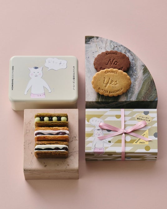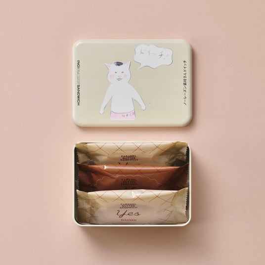 "夢のネコムーランド"のお茶室のための、お茶菓子を探しているという猫村さんに、猫村さん仕様の特別なサンド菓子をお作りさせていただきました。その名も「ノーレーズン猫村さんドイッチ」。缶のほうにはとろけるキャラメルが幸せな余韻を生む2種のキャラメルバターサンドが、紙箱のほうには3種のバターサンドが入っています。また、今回は「きょうの猫村さん」×「ノーレーズンサンドイッチ」な描き下ろし漫画付きしおりを3種類ご用意。猫村さん流のノーレーズンサンドイッチの食べ方や、クスッと笑えるお茶の時間が描かれています。しおりは全3種類のうち、いずれか1種類がランダムで封入されています。そして紙箱のリボンは猫村さんのエプロンを思わせる、特別バージョンの縦結びとなっております。お茶とお菓子をこよなく愛する猫村さんと共に、夢のようなお茶の時間をお届けできますように。