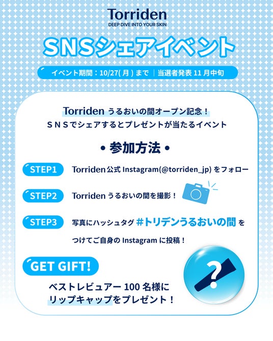 マルマンH&B株式会社(本社:東京都千代田区、代表取締役社長:溝田 勝彦)が展開する韓国スキンケアブランド「Torriden(トリデン)」は、2025年10月8日(水)~10月27日(月)の期間限定で、原宿の「GATE」にてポップアップストア『Torriden うるおいの間』をオープンいたします。本ポップアップストアではオンライン限定販売の商品を含む全ラインアップの販売に加え、ストア限定品や新商品の先行販売も実施予定です。
