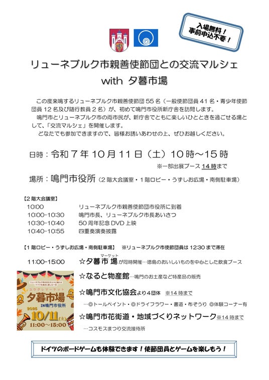来鳴するリューネブルク市親善使節団が鳴門市役所を訪問し、「交流マルシェ」を開催します。