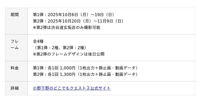 キタムラ・ホールディングス グループのピックハイブ株式会社(本社:東京都新宿区、代表取締役社長兼COO:大迫 由典)が運営するセルフフォトブランド「Photomatic」が、2025年10月6日(月)から人気声優の小野大輔さんと下野紘さんが出演するバラエティ番組「小野下野のどこでもクエスト3」(以下、「どこクエ3」)とコラボレーションした限定フレームを全国7カ所のPhotomaticで発売します。