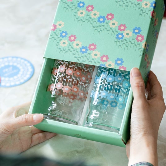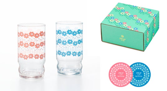 普段使いしやすく安定感のある「アデリアアレンジ」のグラスに、ピンクとブルーの花柄をあしらいました。さらに、おそろいの紙製コースターを添え、色鮮やかな化粧箱へ詰め込んだペアセットとして仕上げています。