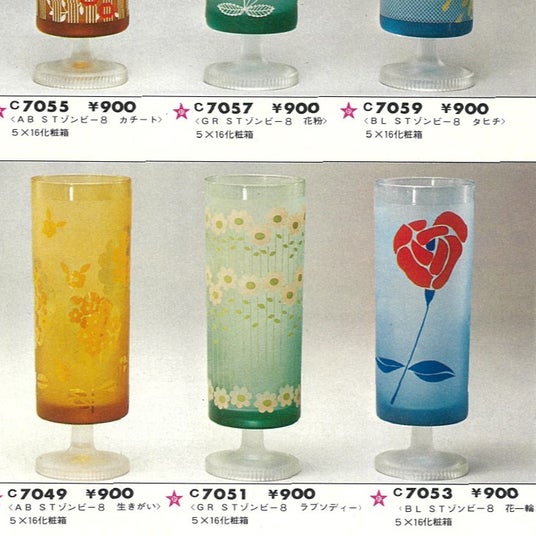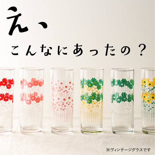 ストライプの白い花柄がかわいらしい人気柄"アデリアラプソディー"は、昭和48(1973)年に"ラプソディー"として販売されていました。当時のアデリアカタログには脚付きグラスが掲載されていましたが、同じ柄でも色や形の異なるグラスが展開され、アデリアレトロファンの間で話題となりました。こうした背景から、「復刻版であるアデリアレトロにも色違いがあったら、きっとかわいい!」という想いを形にし、本商品の発売に至りました。