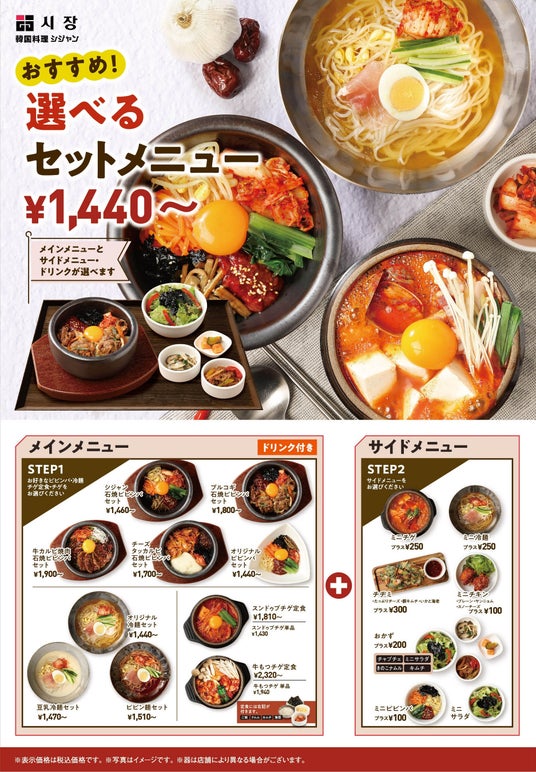 今回のリニューアルでは、定番の「ピビンバ」「冷麺」「チゲ」の3つのカテゴリー各商品10種と、セットでお召し上がりいただけるサイドメニュー11種の中から好きな組み合わせで選べるセットメニューをご用意しました。