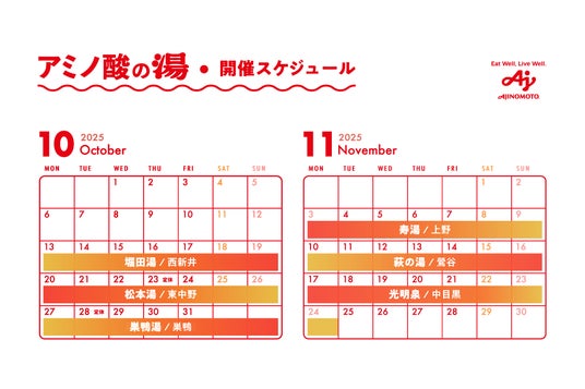 味の素株式会社(社長:中村 茂雄、本社:東京都中央区)は、"様々な仲間と日本人の調子をよくする"ことを目的とした「調子いいやつ!アミノ酸プロジェクト」の一環として、2025年10月13日(月)から11月24日(月)の期間、都内で人気の銭湯6店舗を「アミノ酸の湯」でジャックする取り組みを実施いたします。本企画は、今年の春に東京・大阪の銭湯8店舗とコラボレーションした「アミノ酸の湯」の第2弾で、疲れた体と心を癒す銭湯と再びタッグを組み、約2カ月にわたり、リレー形式で開催します。