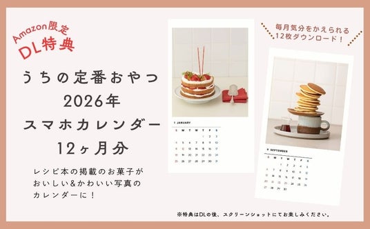 Amazonでは、ご購入いただくと「うちの定番おやつ 2026年スマホカレンダー12ヶ月分」 データがダウンロードできる特典つき。レシピ本掲載のかわいいお菓子が毎月楽しめて気分も上がります!