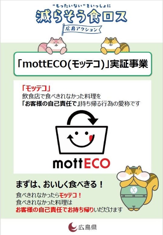 国が推奨するmottECO(モッテコ)※の取組を広げていくため、実証事業として、県内飲食店の協力のもと実施します。