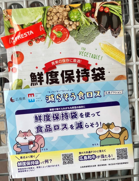 9/28(日)から、「使いきりはじめよう!キャンペーン」をスタートしました。11月末までのキャンペーン期間中、協力店舗※において、ポスターの掲示や鮮度保持袋を配布します。キャンペーン初日(9/28)は、フレスタ廿日市住吉店で、(株)フレスタホールディングス、廿日市市循環型社会推進課及び山陽女子短期大学の連携イベントに合わせて、鮮度保持袋を配布しました。 学生が、食べきりレシピを手渡す際に鮮度保持袋も配布してくれ、多くのお客様に「使いきり」を呼びかけることができました。 なお、食べきりレシピは、山陽女子短期大学の学生が、廿日市市循環型社会推進課及び(株)フレスタホールディングスの協力を得て考案しました。※ 配布情報は、県の食品ロス削減ポータルサイトに掲載しています。