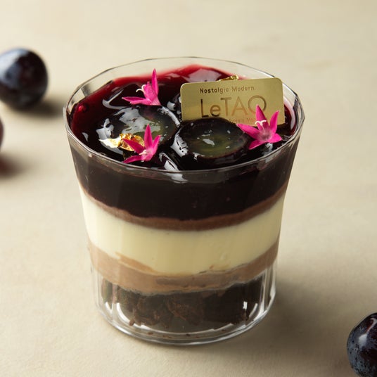芳醇な葡萄ジュース「カベルネピノノワール」を使ったヴェリーヌ。サブレショコラにチョコクリーム、マスカルポーネムースを重ね、トンカ豆の甘い香りで調和。仕上げにピノノワールジュレと巨峰を添えました。