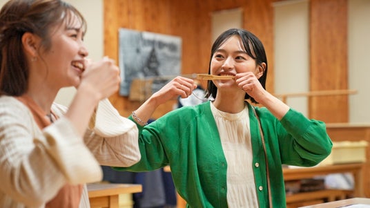 小さな弁の音を口の中で響かせて鳴らすアイヌ民族の伝統的な楽器ムックリ(口琴)の演奏方法を学べます。雨風の音、動物の声、自分の感情などを自由に表現。音色は口内の空間の大きさや息を吸う、吹くことなどで変化。自由度が高くクセになります。