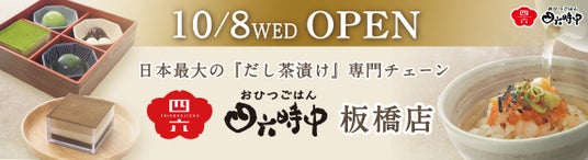 日本最大のだし茶漬け専門チェーン『おひつごはん四六時中』を運営する株式会社イオンイーハート(所在地:千葉県千葉市、代表取締役社長:奥野善徳、以下当社) は、10月8日(水) に『おひつごはん四六時中』板橋店を「だし茶漬け」と「カフェ」融合の新業態としてリニューアルいたします。