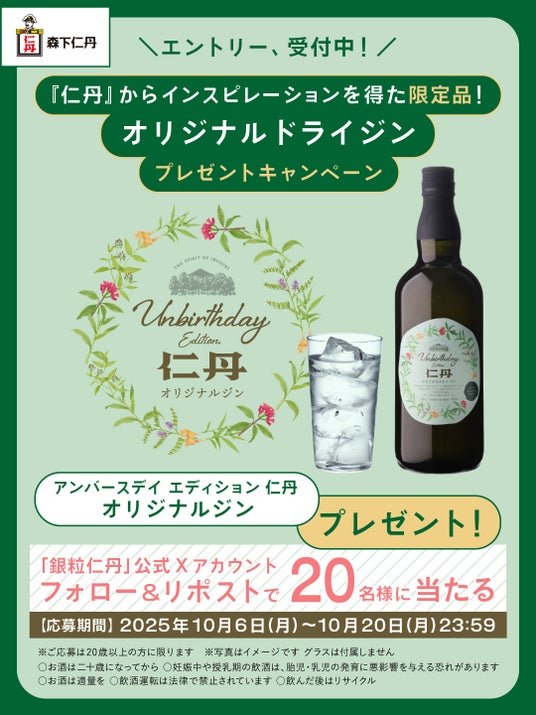 森下仁丹株式会社(本社:大阪市、代表取締役社長 森下雄司、以下「当社」)は、「仁丹」シリーズ発売120周年を記念し、日本最古のハーブ園のボタニカルを使用した本格国産クラフトジン「アンバースデイ」とコラボした限定生産品「アンバースデイ エディション仁丹 オリジナルジン」のプレゼントキャンペーンを、「銀粒仁丹」公式Xにて2025年10月6日(月)~10月20日(月)の期間限定で実施いたします。