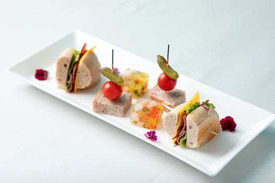 七面鳥のパストラミとチーズのベーグルサンド、海老と彩り野菜のアスピック、熊本県産りんどうポークのパテ・ド・カンパーニュ