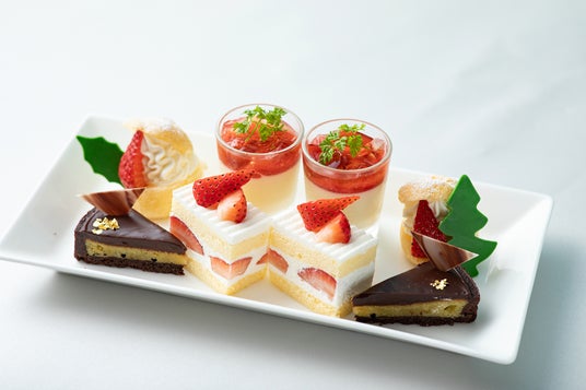 苺のショートケーキ、チョコレートタルト、苺のプチシュークリーム、ホワイトチョコレートのパンナコッタ