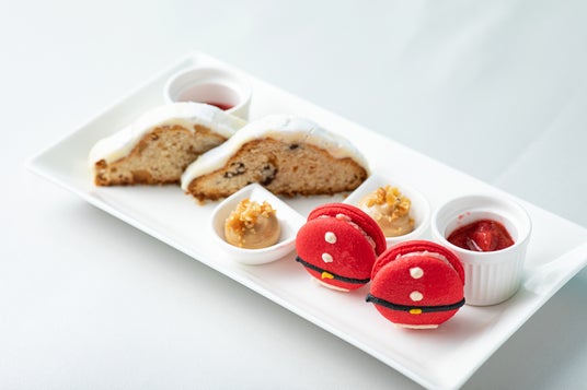 焼き菓子には、ドイツの代表的なクリスマス菓子"シュトーレン"や「ラウンジ サウスコート」のアフタヌーンティーに欠かせない"マカロン"はサンタクロースの赤い服に衣装替え。別皿でご用意するプレーンとキャラメル、2種類のスコーンと一緒にお楽しみいただく"ベリージャム"と"クルミ入りメープルバター"で、心躍るホリデーシーズンならではの特別感を演出します。