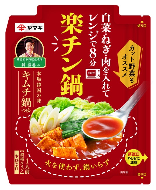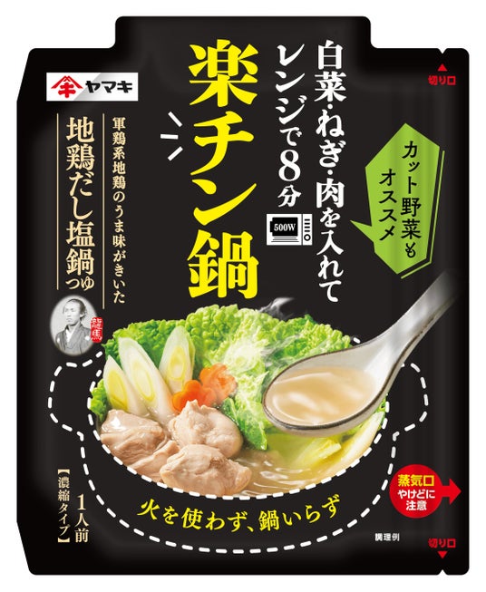 『楽チン鍋(R)』シリーズは、袋に具材を入れて電子レンジで8分加熱するだけで、1人前の鍋が完成する鍋つゆです。火や鍋を使わずに調理でき、市販のカット野菜を使えばまな板や包丁を使わずに調理できます。洗い物も少なく、忙しい日でも手軽に本格的な鍋を楽しめます。「鰹節屋・だし屋、ヤマキ。」ならではの技術で、電子レンジ調理でもだしの香りとうま味をしっかり感じられる設計に仕上げています。