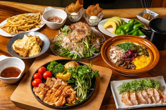 鶏で始まり、鶏で〆る。見た目にも賑やかな<若鶏の農場ステーキ>をメインに、締めまでしっかり鶏を味わえる鍋ナシプランです。