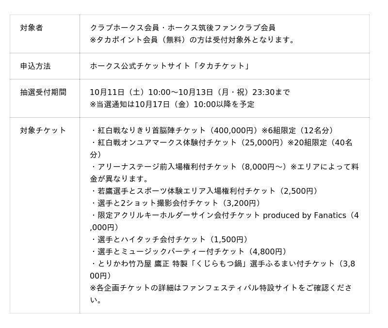 クラブホークス会員・ホークス筑後ファンクラブ会員限定でイベント参加権利付きスペシャルチケットを抽選で販売します。