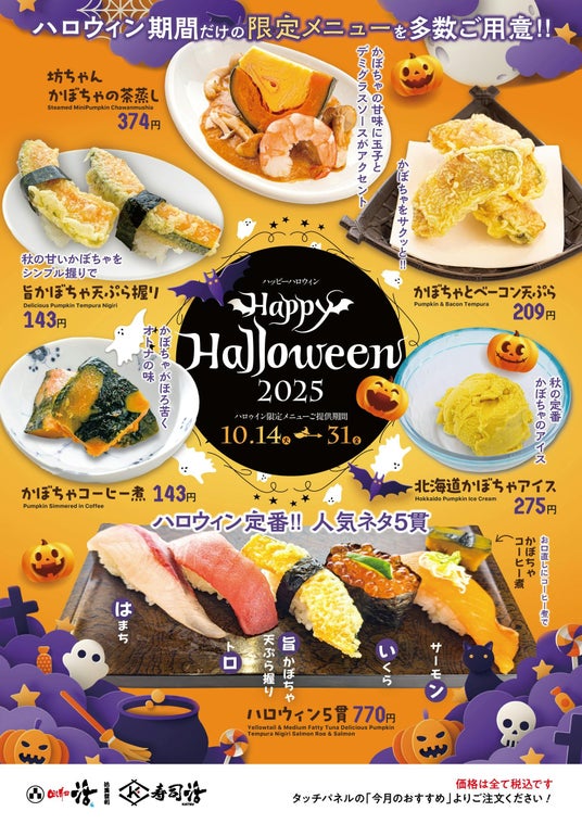 秋の定番「かぼちゃ」を主役にしたメニューや、人気ネタを詰め込んだ華やかな5貫セットなど、ハロウィンを彩る楽しいラインナップが勢ぞろい!