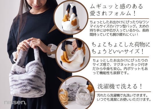 デザインは猫が丸まって眠る姿をイメージしたムギュッとしたバケツ型。ちょっとした買い物や散歩など日常の外出に使いやすく、機能性と遊び心を両立したアイテムです。