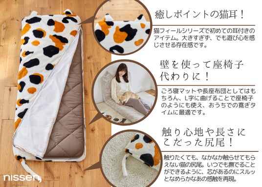 人気商品の「敷きパッド」に着想して生まれたのが「ごろ寝マット用カバー」です。「猫フィール」特有のなめらかな肌触りが、横になった瞬間にリラックス感を高めます。デザイン面ではシリーズ初となる猫耳をワンポイントとしてあしらいました。"しっぽ付き"アイテムに続く新しいデザイン要素として、猫好きの方に親しんでいただける仕様となっています。