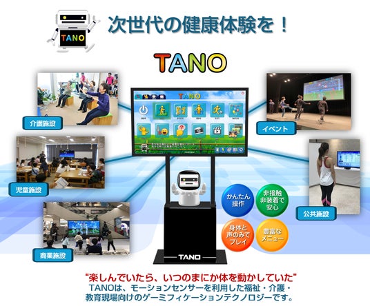 TANOは、非接触・非装着型センサーを活用した福祉・介護・教育分野向けのゲーミフィケーションテクノロジーです。画面の前に立つだけで身体がコントローラーとなり、運動・発声・認知機能を楽しくトレーニングできます。搭載されているコンテンツは300種類以上。現場の声や利用者、専門家の意見を取り入れて開発されており、誰でも直感的に取り組めるのが特長です。