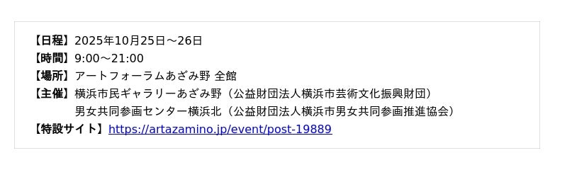 アートフォーラムあざみ野は、男女共同参画センター横浜北と横浜市民ギャラリーあざみ野の複合施設として2005年10月に開館して以来、地域の皆様に支えられ、育まれて今年で20歳の誕生日を迎えます。上映会やワークショップ、マルシェなどが楽しめる2日間。企画展やギャラリーもめぐって、心おどる秋のひとときをお楽しみください。