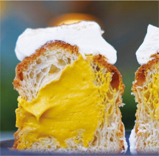 クロフィンには様々なクリームが詰められていることが多く、今回は旬のかぼちゃを優しい甘さのクリームに仕上げてたっぷりと絞り入れました。トッピングにはとろけるような練乳ホイップクリームにシナモンパウダーをふりかけています。