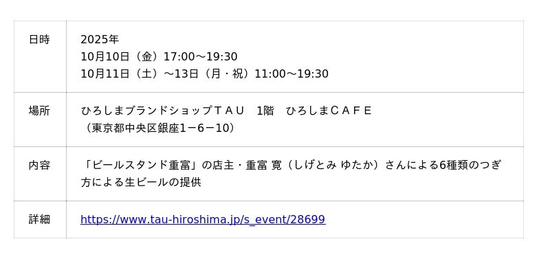 【開催日】2025年10月10日(金)~10月13日(月・祝)【会場】ひろしまブランドショップTAU1階 ひろしまCAFE