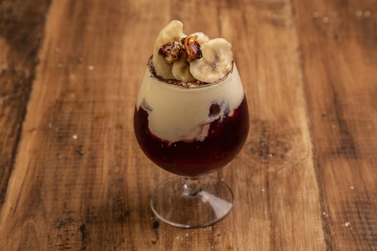 【季節のサングリア】キャラメルバナナサングリア 840円(税込)パフェのような見た目の新感覚サングリアをご用意。キャラメルのほろ苦さと甘いバナナクリームとの組み合わせは、お酒が苦手な方でも楽しめる1杯です。チーズ料理、スイーツとの相性も抜群です。