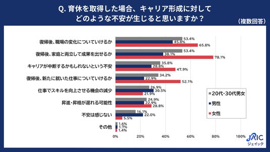 「育休を取得した場合、キャリア形成に対してどのような不安が生じると思いますか?あてはまるものをすべて選択してください」と質問したところ、「復帰後、職場の変化についていけるか」「復帰後、家庭と両立して成果を出せるか」がそれぞれ53.4%、「キャリアが中断するかもしれないという不安」が35.8%、「復帰後、新たに就いた仕事についていけるか」が34.2%、「仕事でスキルを向上させる機会の減少」が26.9%、「昇進・昇格が遅れる可能性」が24.9%、「不安は感じない」が16.1%、「その他」が1.6%となりました。