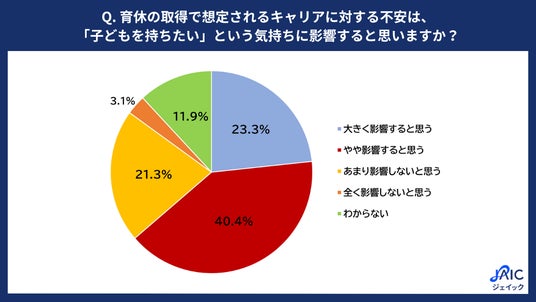 「育休の取得で想定されるキャリアに対する不安は、「子どもを持ちたい」という気持ちに影響すると思いますか?」と質問したところ、「大きく影響すると思う」が23.3%、「やや影響すると思う」が40.4%、「あまり影響しないと思う」が21.3%、「全く影響しないと思う」が3.1%、「わからない」が11.9%となりました。「大きく影響すると思う」と「やや影響すると思う」を合わせると、回答者の6割以上が、育休取得によって生じるキャリアに対する不安が、子どもを持つことへの意欲に影響を与えていると考えていることがわかりました。