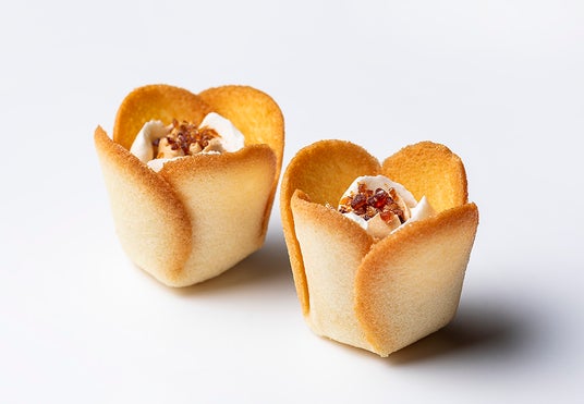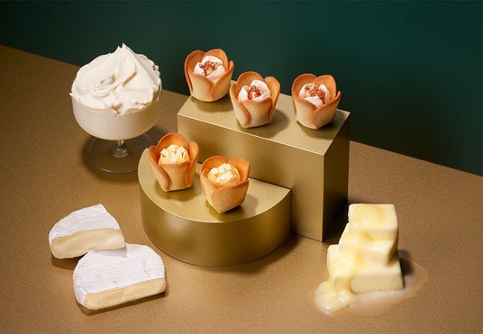 1品目は、とろけるチーズケーキのバラ。バン=マリィ(湯煎焼き)でじわじわ優しく火を通し、みずみずしい半生食感に仕上げました。半熟たまごのようにスプーンですくうと、とろっと濃厚にとろけだして、カマンベール&クリームチーズのコクが口いっぱいに広がります。生まれたてのチーズケーキのバラをどうぞ。