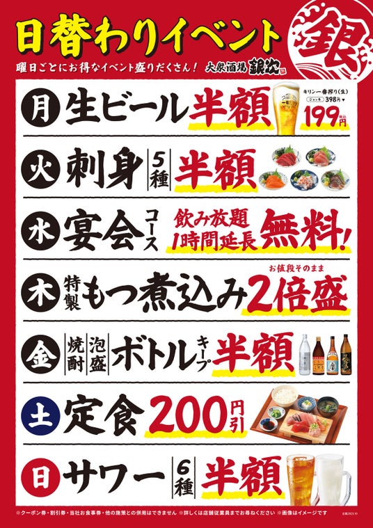 お客様の日常に寄り添い、「今日は銀次で一杯」と気軽に立ち寄っていただけるお店を目指しています。オープンを記念し、10月7日から2日間の"オープン記念 全品半額セール"を開催いたします。