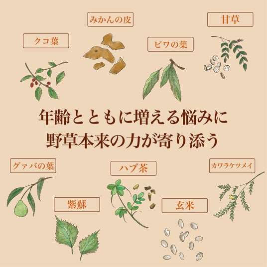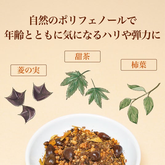 「年齢のお悩みに寄り添う自然の力」に着目した、香ばしく飲みやすいオリジナルブレンド茶。ノンカフェインで家族みんなにやさしく、1包から繰り返し楽しめる新習慣を。