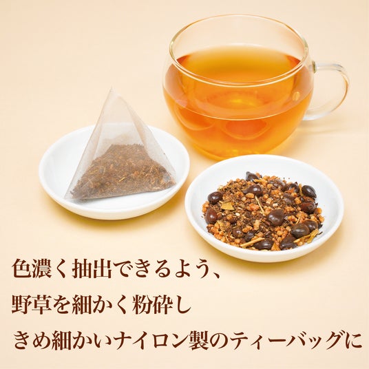 永養茶は、細かく粉砕した野草をたっぷり詰め込んでいるため、濃い味わいをしっかりと抽出できます。さらに、きめ細かいナイロン製のティーバッグを使用することで、見た目にも中身の野草が美しく映える仕上がりにしました。