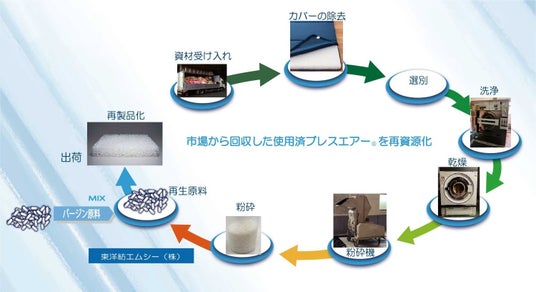 使用済みとなった「BA-4 マットレス」を回収し、中材の「ブレスエアー(R)」を粉砕、バージンの「ブレスエアー(R)」原料と混ぜて再生「ブレスエアー(R)」で「BA-4 マットレス」を再生産します。