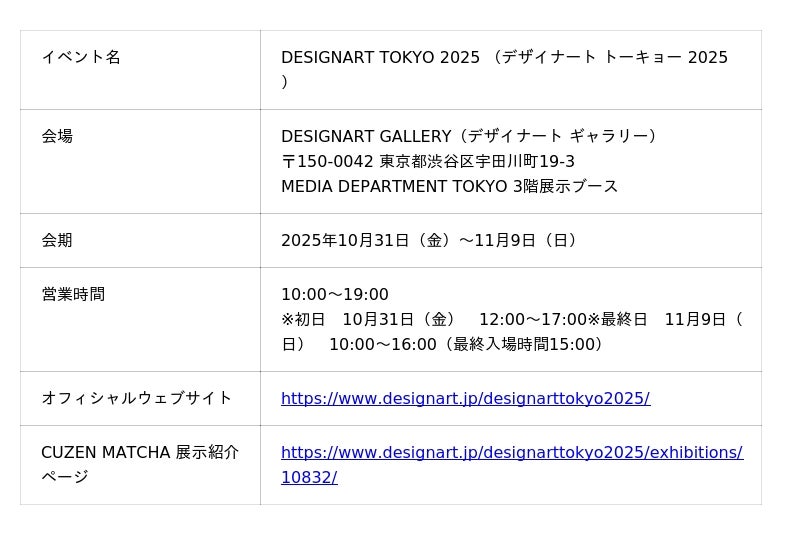 CUZEN MATCHAは、DESIGNART 2025公式ドリンクに選定されました。会期中、1階インフォメーションカウンターで配布されるリーフレットをお持ちいただき、3階のCUZEN MATCHAブースへお越しくださったすべての来場者に、会期中もれなく挽きたて抹茶を無料でご試飲いただけます(配布数に上限がある場合があります)。■ 出展概要