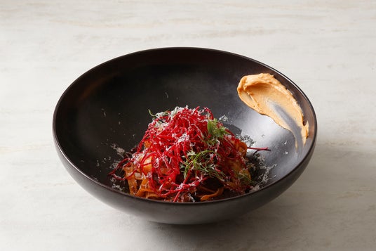 <シェフおすすめ 2.> 国産牛すじ肉煮込みのタリアテッレじっくりと煮込まれた牛すじ肉のとろけるような旨みが、平たいタリアテッレにたっぷりと絡む贅沢な味わいのパスタ。ピリッとしたかんずりをまろやかにしたクリームと、シャキシャキとした食感も楽しめるビーツとルッコラのサラダと合わせてお楽しみください。