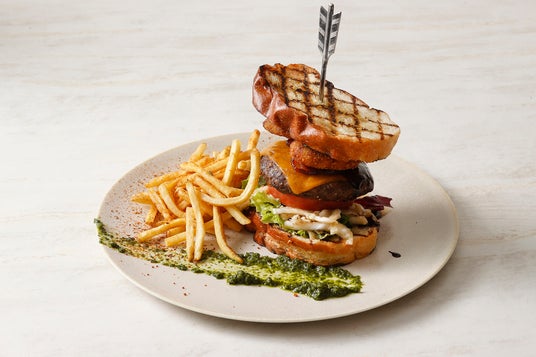 メインディッシュは、旨味がたっぷり入ったシェフ一押しの国産牛すじ肉煮込みのタリアテッレや、ピリッとスパイシーなメカジキのマリネ、オリジナルアレンジのブラックババガヌーシュとハリッサのアクセントをソースで楽しむ信玄鶏腿肉のバターミルクマリネや、きのこの豊かな香りを纏った牛サーロインのグリルなど豊富なラインアップでご用意。さらに、驚くほどにビッグサイズな石窯ブレッドバーガーは、コクの効いたカカオてりやきソースに椎茸といぶりがっこのコールスローなどをトッピングした新感覚な味わいでお届け。